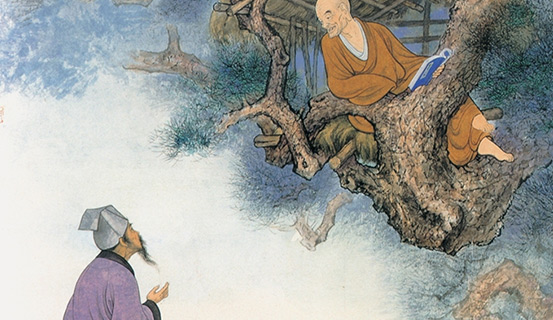 Một hôm quan Thị lang Bạch Cư Dị, một thi hào lừng danh đương thời, đi dạo ngang cổng chùa trông thấy nhà sư đang ngồi vắt vẻo trên tang cây, vốn không ưa hạng người “lánh nợ đời” như thế, ông cau mày hỏi: