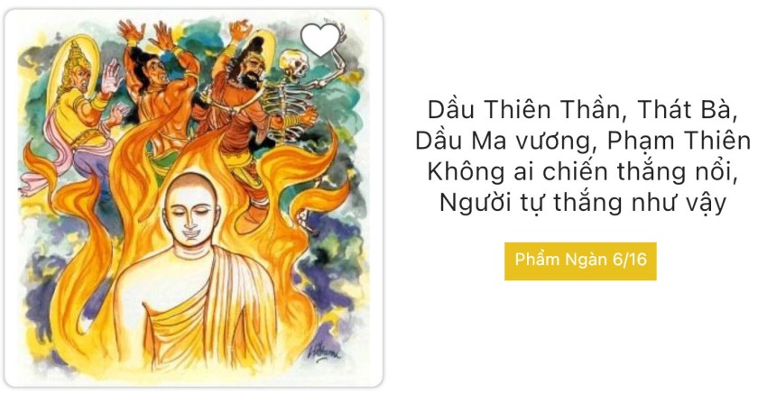- Bà-la-môn, chiến thắng kẻ khác là một việc tầm thường, chiến thắng như thế đâu có lợi lạc gì. Nhưng người nào thắng lướt Dục lạc và tự thắng mình, thì chiến thắng như thế lợi lạc hơn, không ai có thể đánh bại mình.